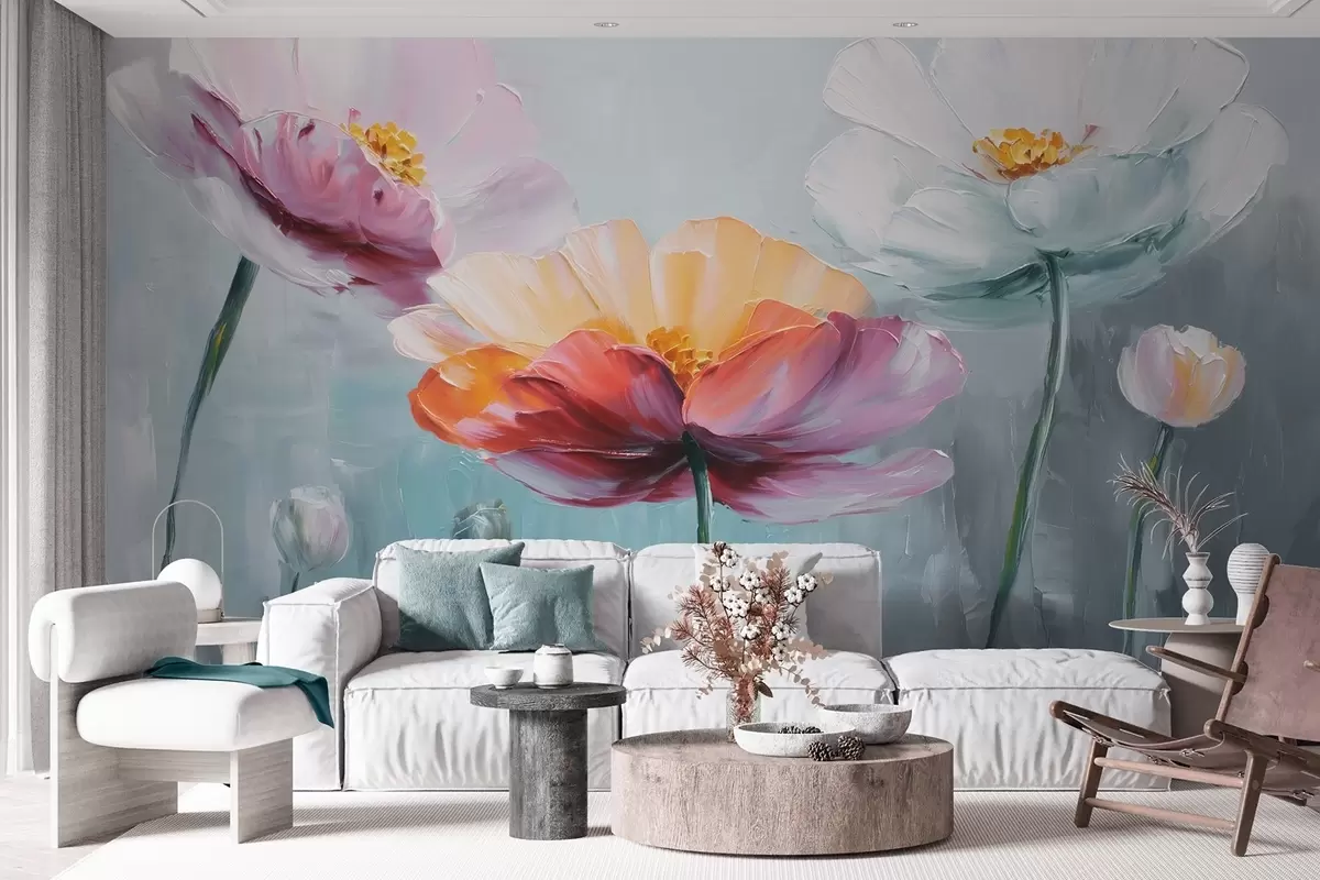 Fotomurales Flores brillantes en técnica de pintura al óleo sobre fondo azul Nr. w09310