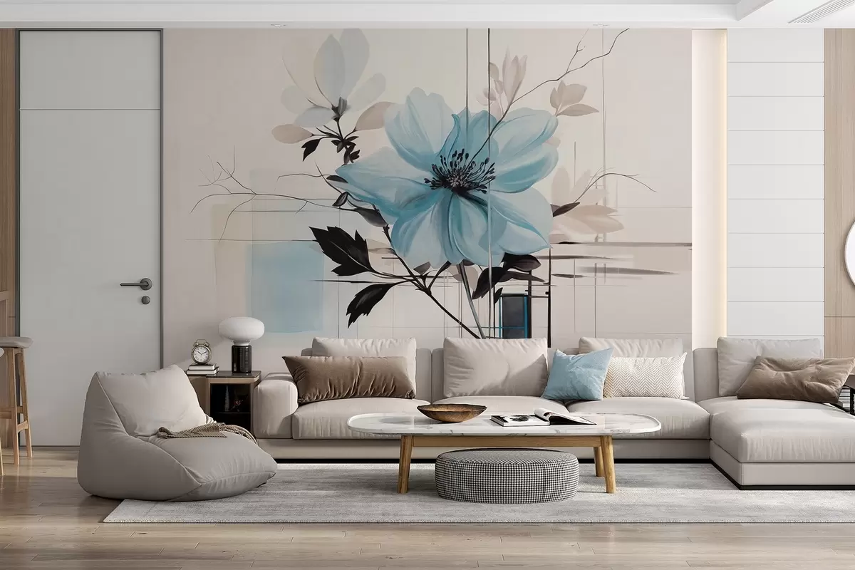 Fotomurales Flor abstracta azul texturizada con hojas y ramas oscuras, formas geométricas minimalistas y líneas en colores apagados Nr. w09332