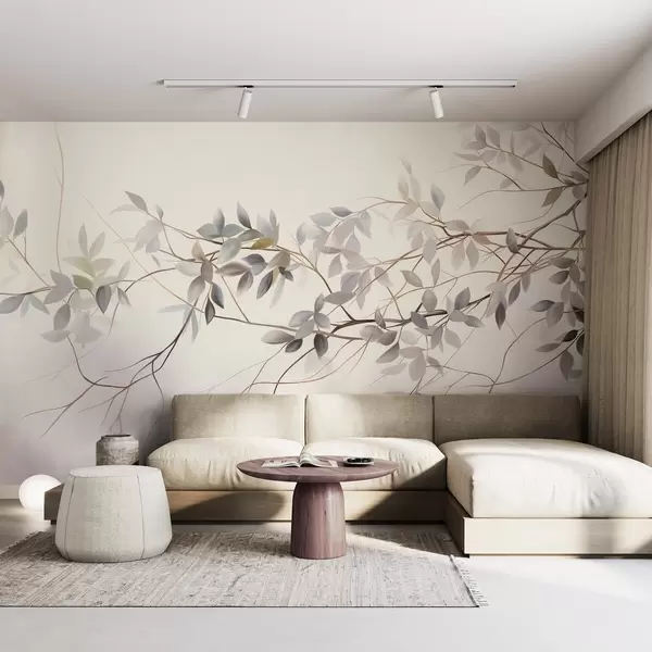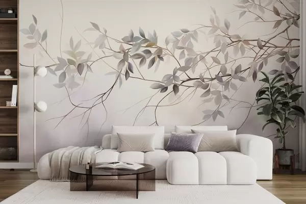 Fotomurales Ramas de textura delicada con hojas en tonos grises, morados y verdes apagados sobre un fondo suave y difuminado Nr. w09336