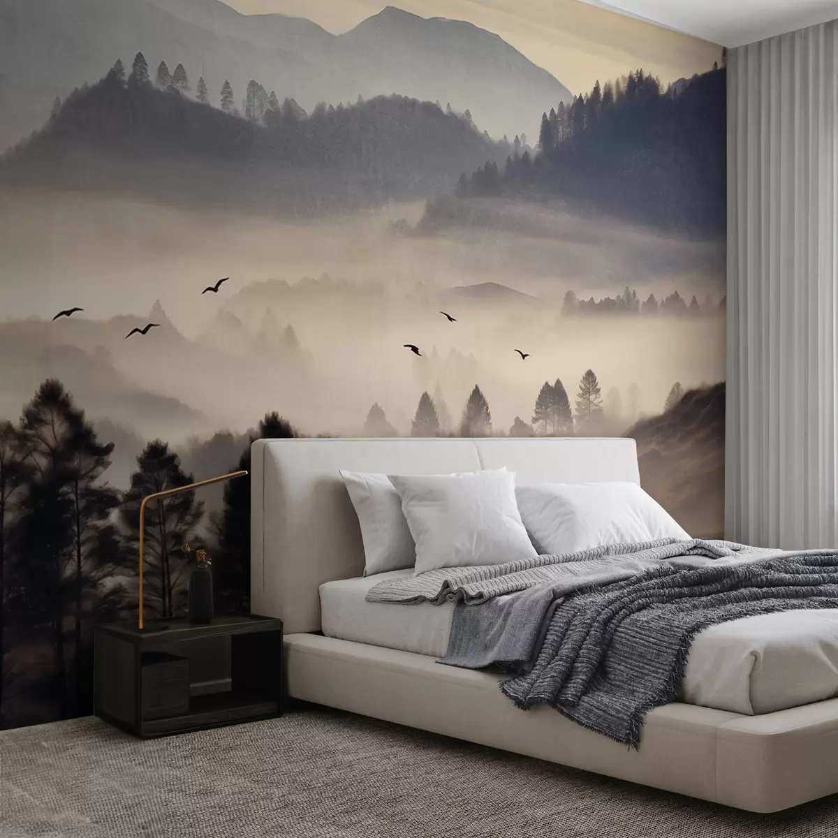 Fotomurales Paisaje montañoso texturizado con capas de niebla, árboles silueteados en primer plano, cordillera distante, iluminación suave Nr. w09338