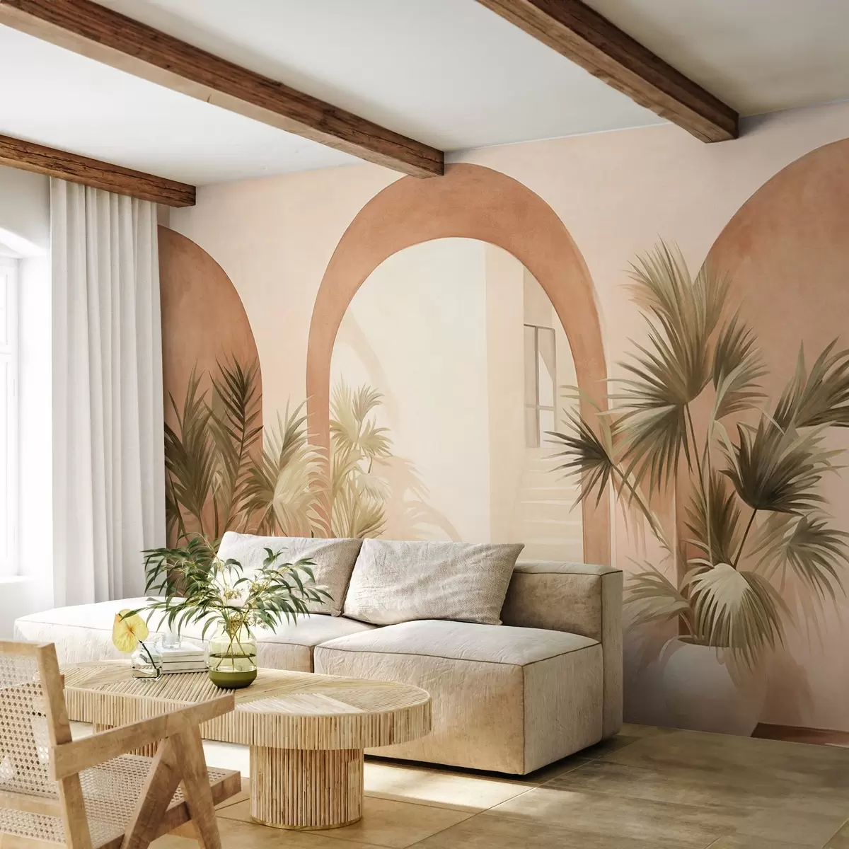 Fotomurales Arcos texturizados con plantas en macetas, paleta de colores beige claro, diseño minimalista, escalera al fondo Nr. w09339
