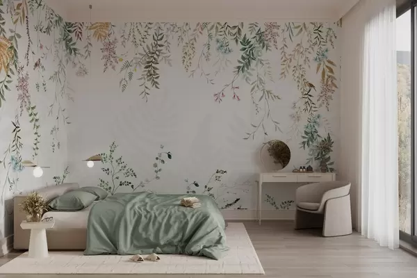 Fotomurales Ilustración botánica con helechos, hierba y plantas colgantes, tonos pastel, sobre fondo blanco estilo acuarela texturizada Nr. w09364