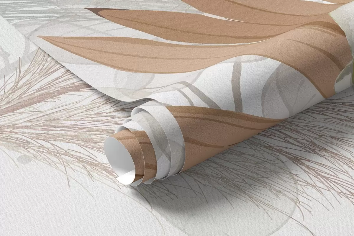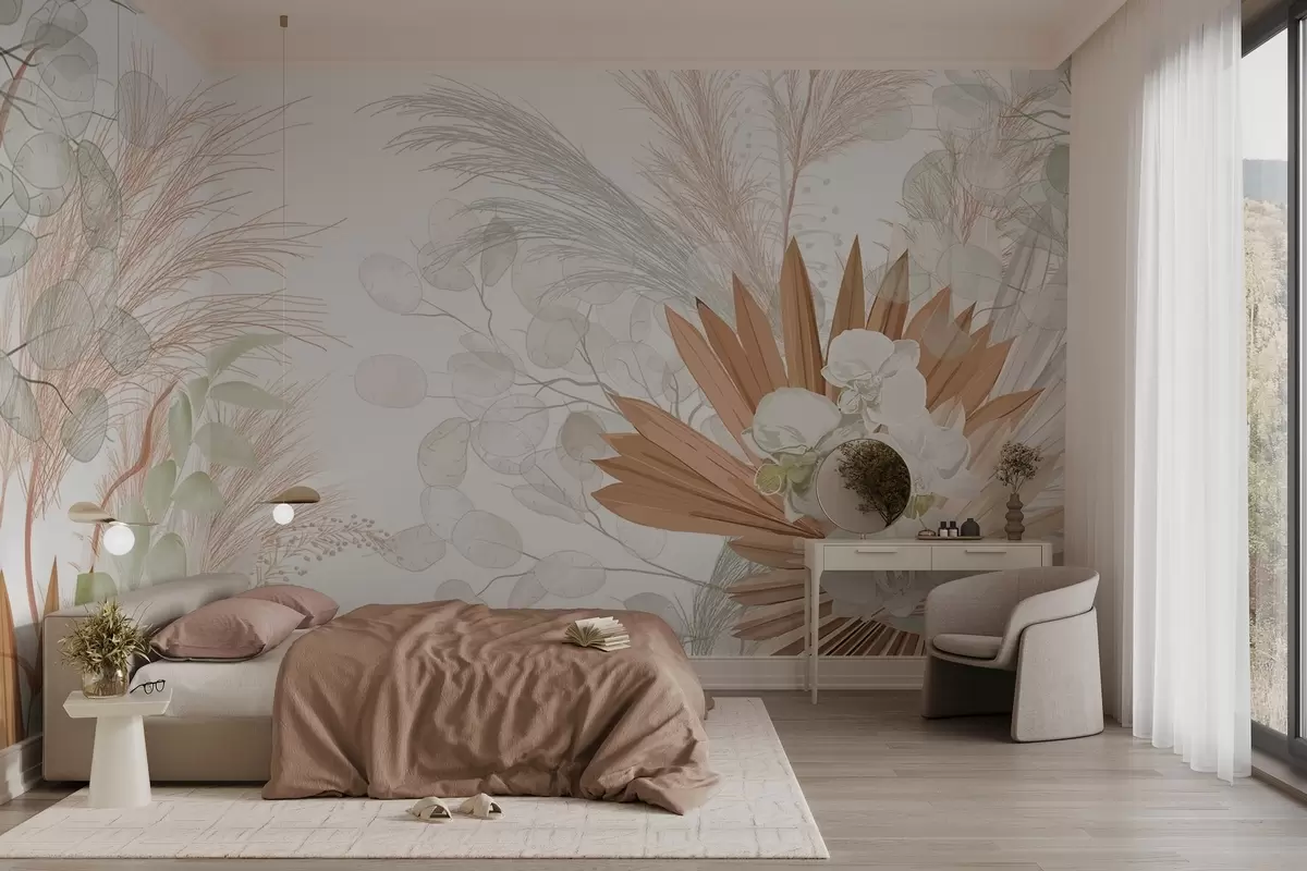 Fotomurales Hierba de la pampa, eucalipto, hojas tropicales y orquídeas sobre fondo blanco, colores pastel. Nr. w09366