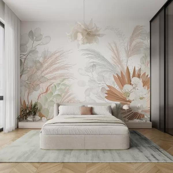 Fotomurales Hierba de la pampa, eucalipto, hojas tropicales y orquídeas sobre fondo blanco, colores pastel Nr. w09366
