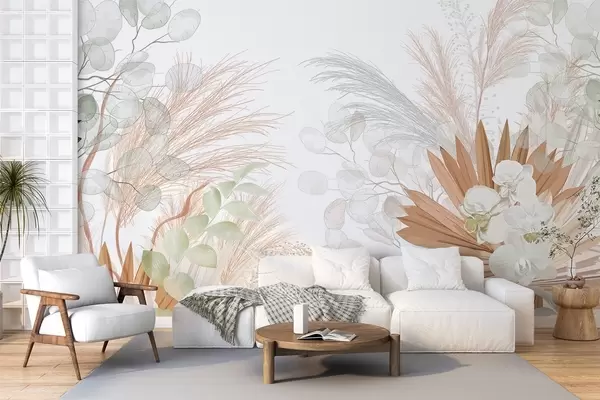 Fotomurales Hierba de la pampa, eucalipto, hojas tropicales y orquídeas sobre fondo blanco, colores pastel. Nr. w09366