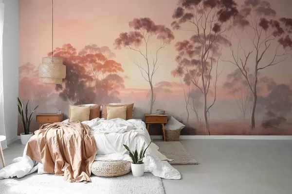 Fotomurales Un paisaje con eucaliptos en un campo con cielo rosa pastel y naranja, una ligera niebla, pintura estilo texturizado Nr. w09367