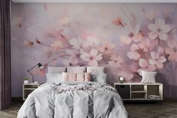 Fotomurales Un arreglo floral con delicadas flores de bordes suaves y difuminados, sobre un fondo pastel de tonos lavanda y rosa claro Nr. w09369