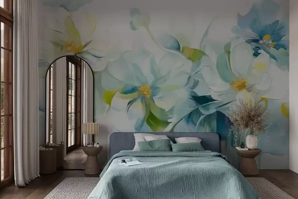 Fotomurales Flores abstractas blancas y azules con pistilos amarillos y hojas verdes, en un fondo blanco, estilo de pintura texturizada Nr. w09372