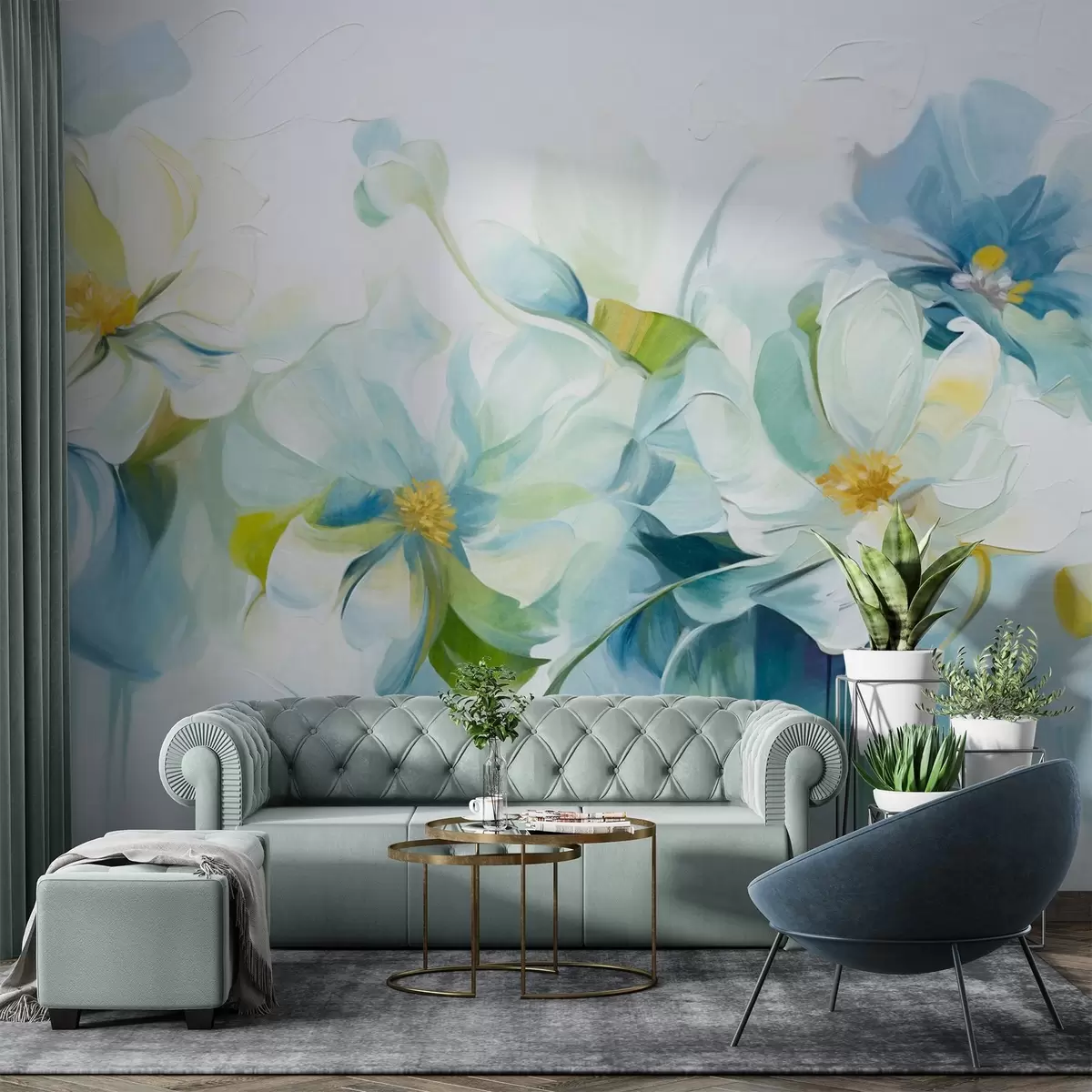 Fotomurales Flores abstractas blancas y azules con pistilos amarillos y hojas verdes, en un fondo blanco, estilo de pintura texturizada Nr. w09372