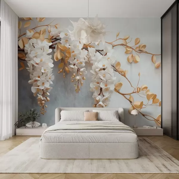 Fotomurales Flores blancas de glicinia con hojas amarillas sobre una rama, cayendo en cascada sobre un fondo blanco texturado, pétalos delicados Nr. w09381