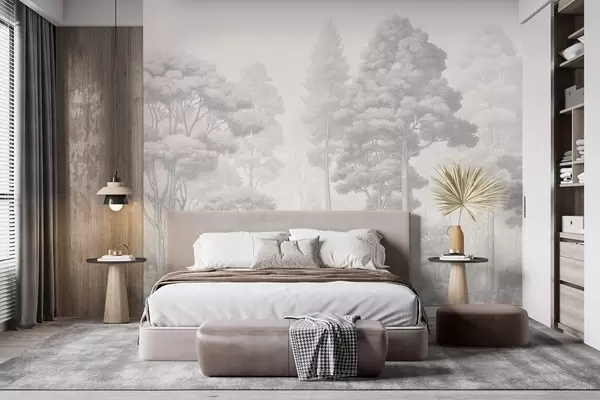 Fotomurales Paisaje forestal artístico en la técnica del sombreado gráfico en blanco y negro Nr. w09411