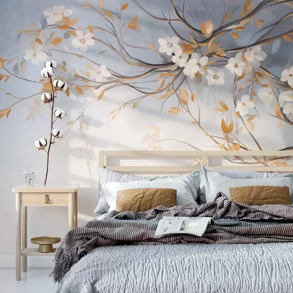 Fotomurales Flores blancas con hojas naranjas en una rama de árbol, fondo azul claro con textura, delicadas pinceladas Nr. w09415
