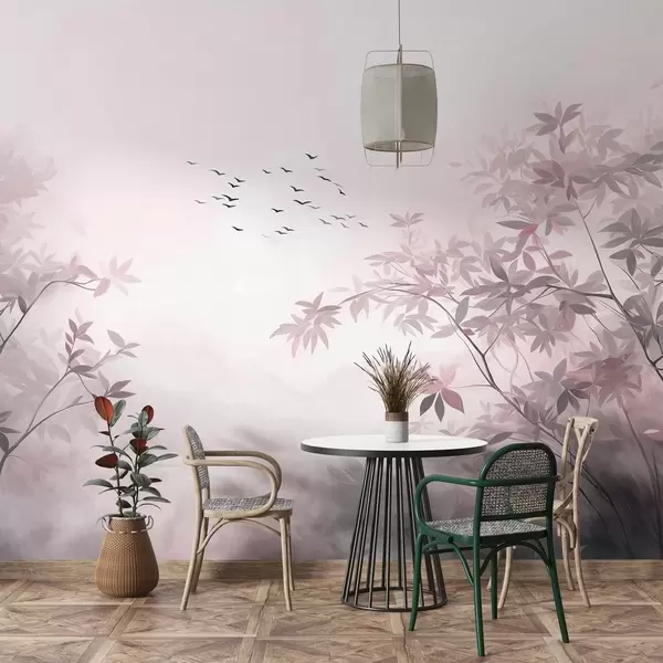 Fotomurales Paisaje texturizado con árboles y una bandada de pájaros volando en el cielo, colores pastel, escena natural Nr. w09418v1