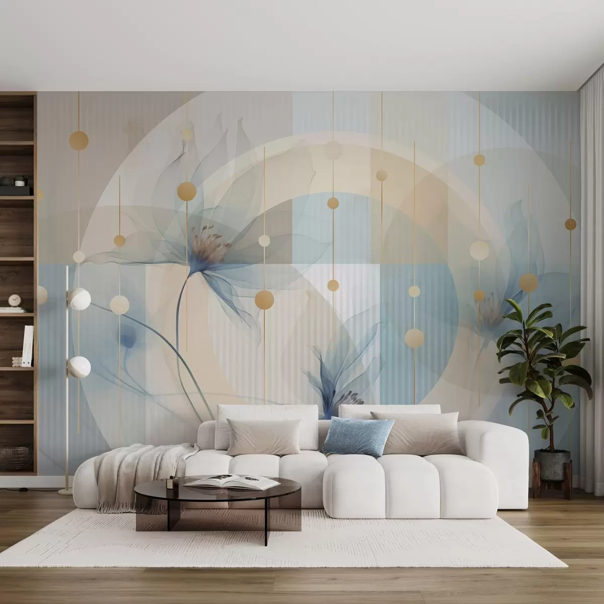 Fotomurales Flores abstractas translúcidas, círculos y formas geométricas, paleta de colores azul pastel, beige y blanco Nr. w09419