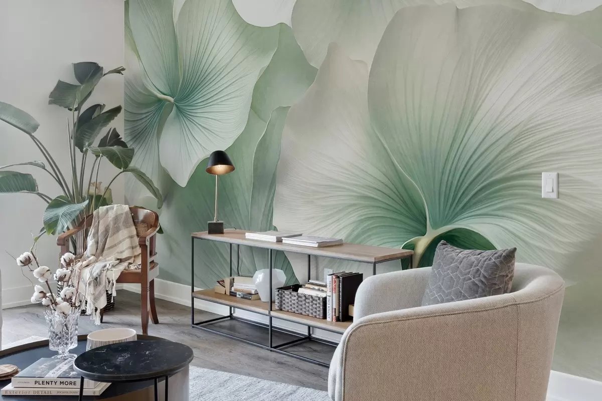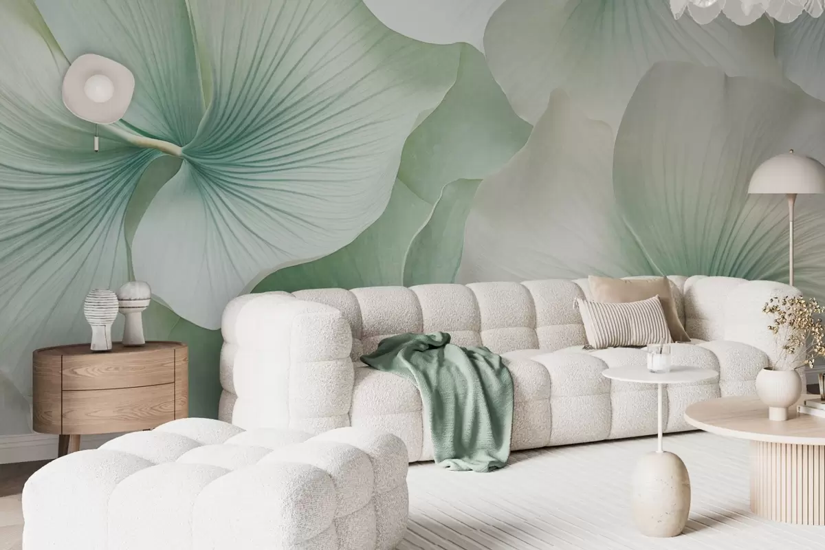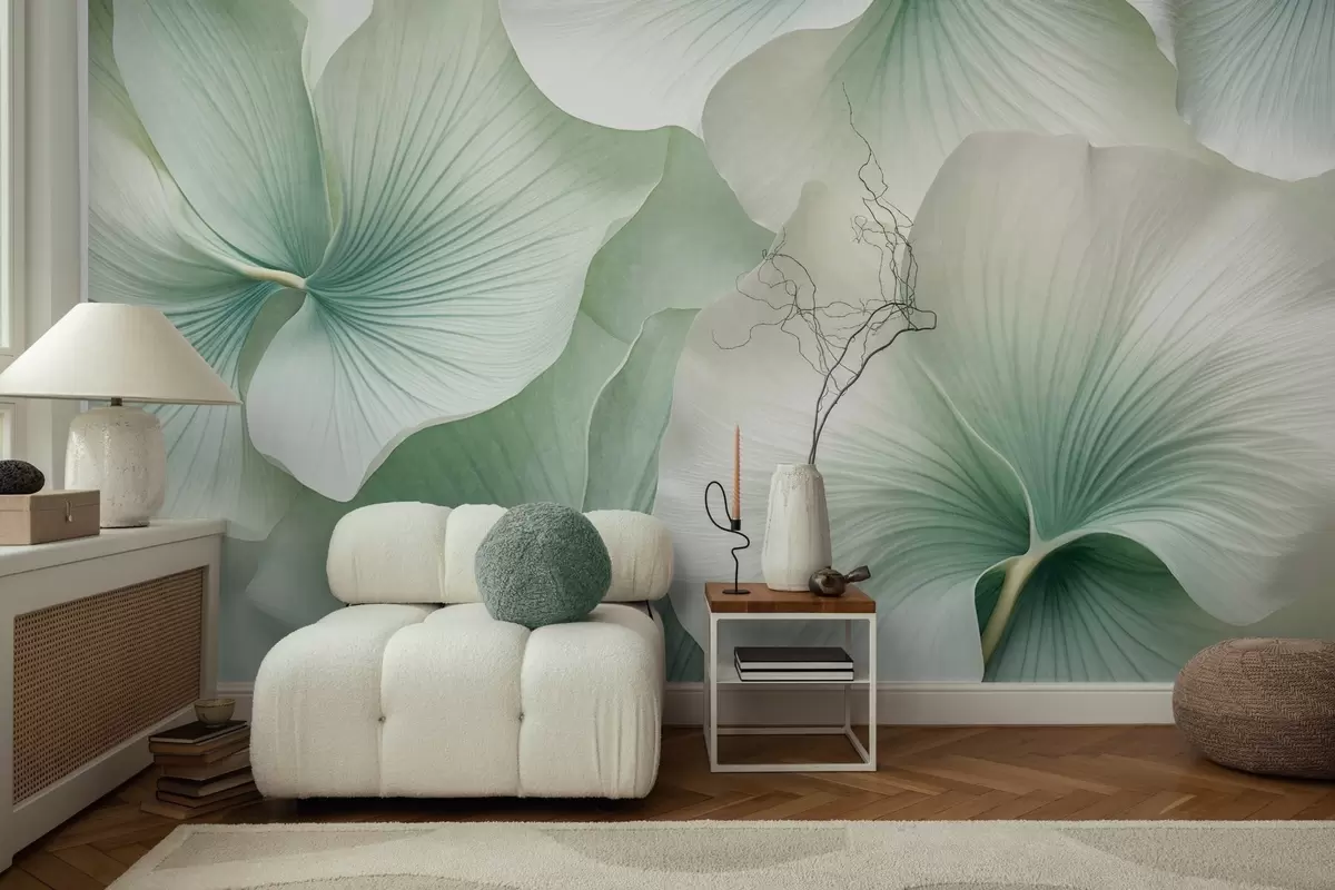 Fotomurales Hojas de ginkgo blancas y verdes, textura suave, fondo floral abstracto, estilo minimalista moderno Nr. w09421
