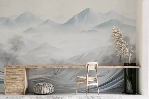 Fotomurales Paisaje montañoso abstracto nevado con árboles blancos y niebla, estilo minimalista con textura Nr. w09426