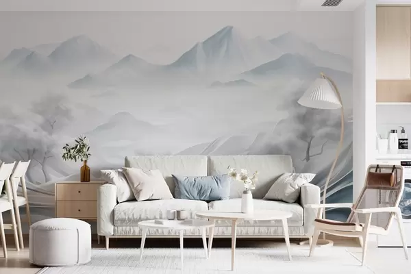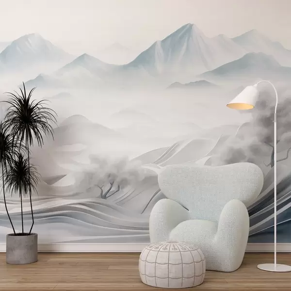 Fotomurales Paisaje montañoso abstracto nevado con árboles blancos y niebla, estilo minimalista con textura Nr. w09426