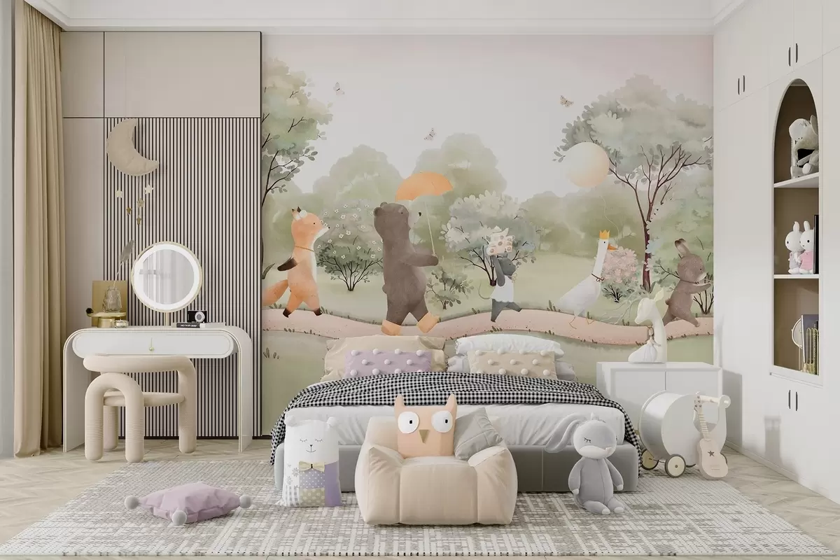 Fotomurales Viaje festivo de pequeños animales por el bosque en estilo acuarela Nr. w09440