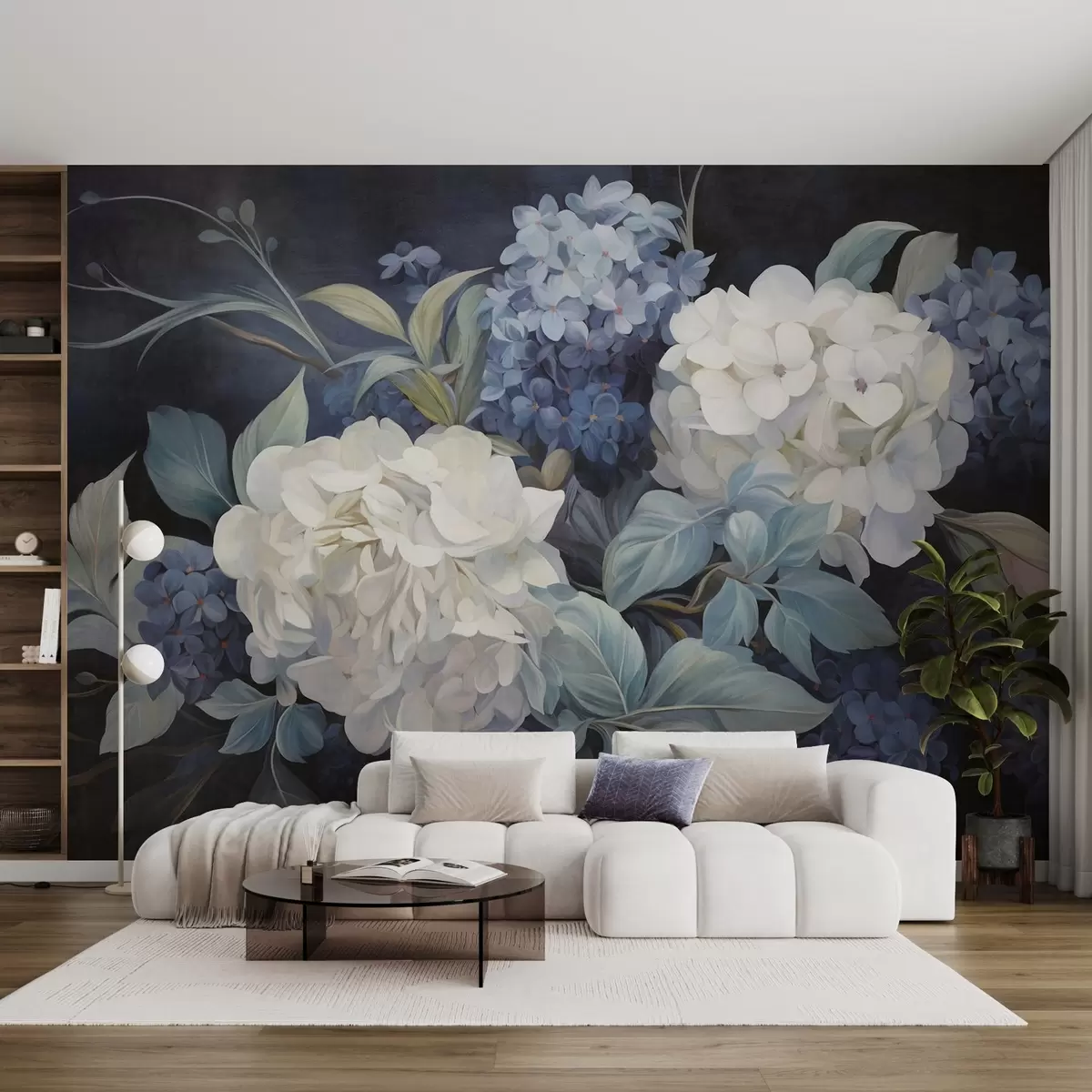 Fotomurales Pintura texturizada en azul oscuro imitando flores de hortensias con hojas grandes, fondo abstracto y oscuro Nr. w09465v1