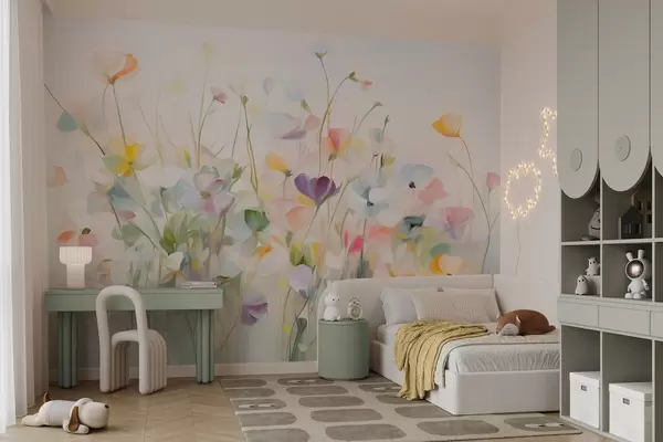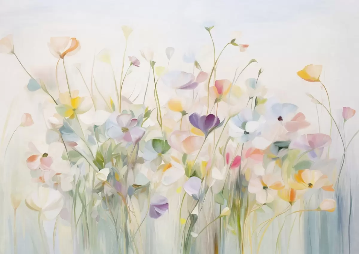 Fotomurales Campo abstracto de flores coloridas con tallos largos y hojas verdes, texturizado, colores pastel y claros Nr. w09466
