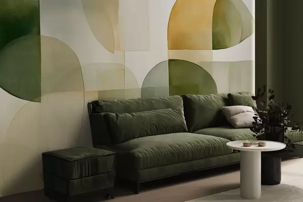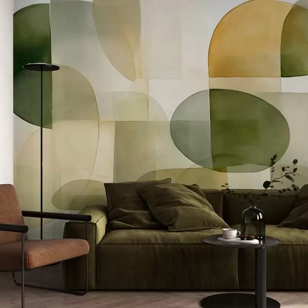 Fotomurales Formas abstractas con textura en tonos verdes y amarillos, colores apagados, composición minimalista, fondo neutro Nr. w09467
