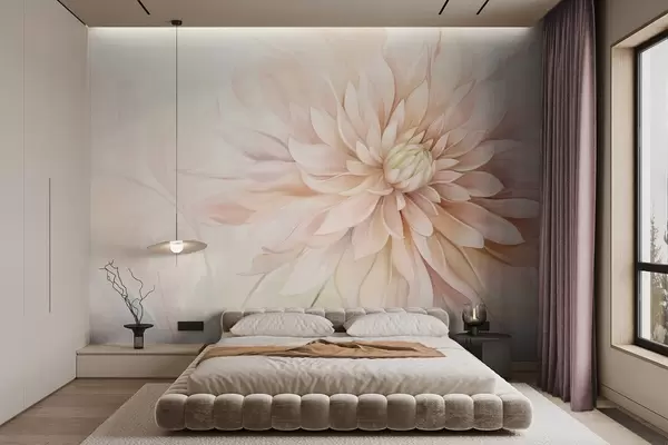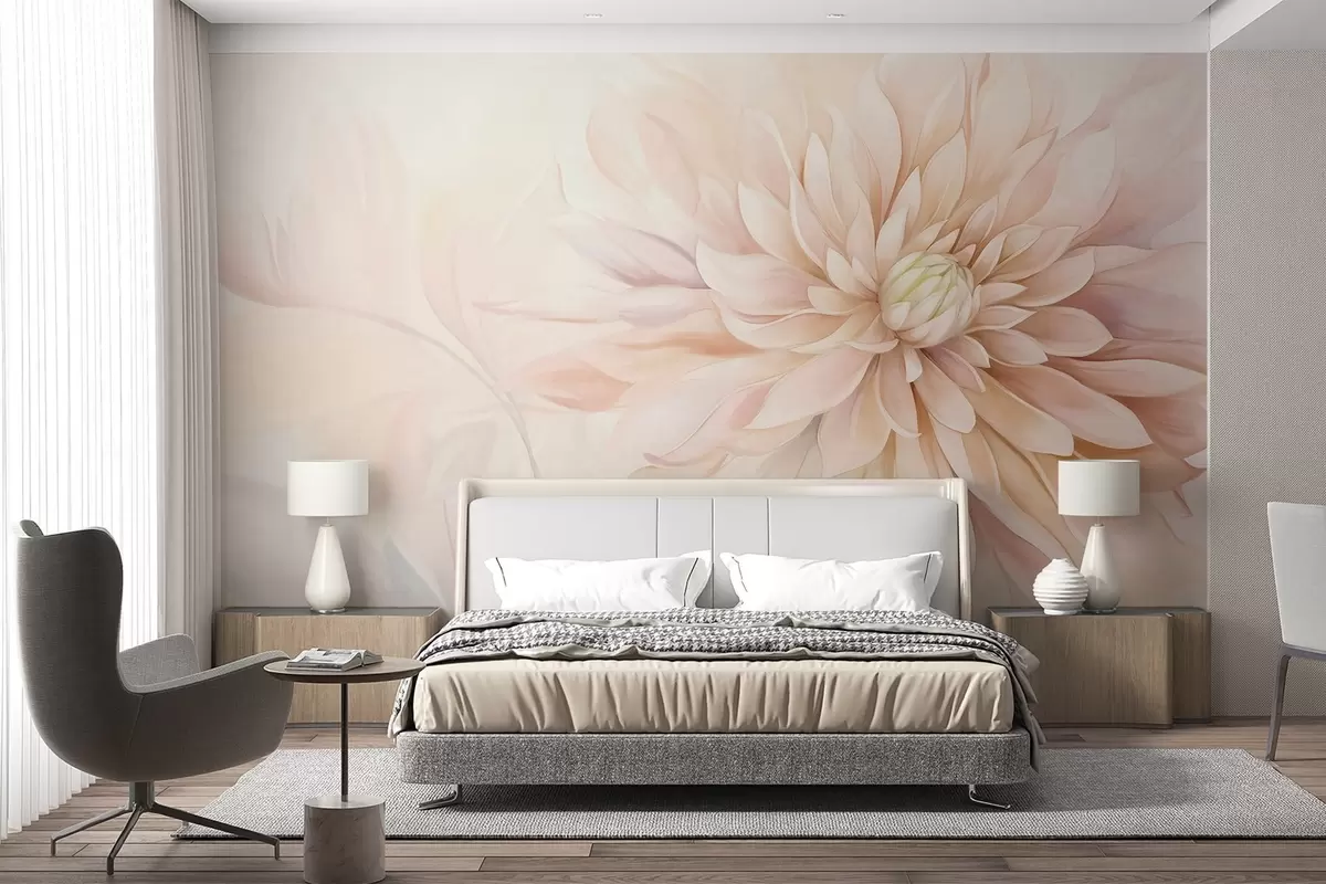 Fotomurales Una flor de dalia rosa claro con muchos pétalos, fondo pastel de textura suave con toques de verde y beige Nr. w09470