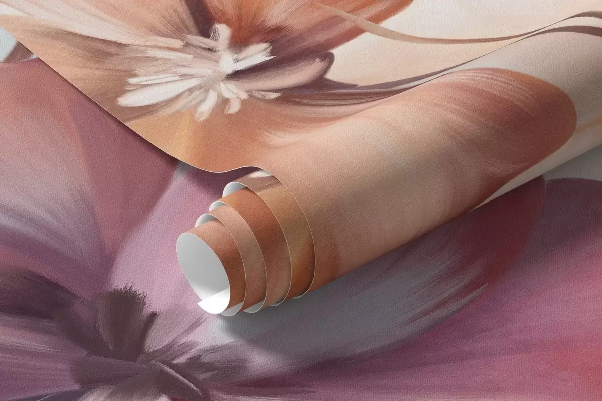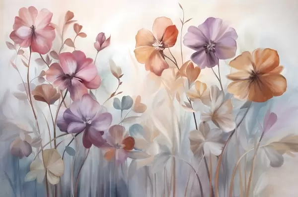 Fotomurales Arreglo floral texturizado con flores rosas, moradas y naranjas con tallos y hojas verdes, en suaves colores pastel Nr. w09486