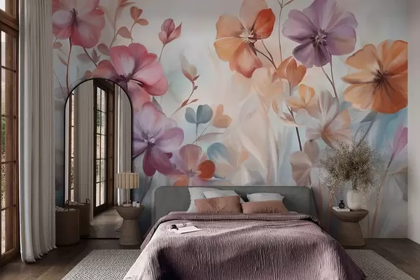 Fotomurales Arreglo floral texturizado con flores rosas, moradas y naranjas con tallos y hojas verdes, en suaves colores pastel Nr. w09486