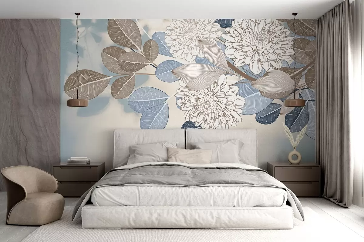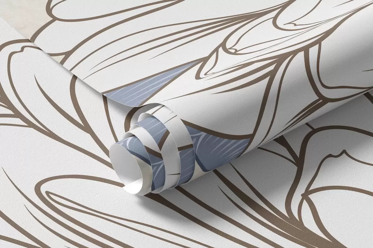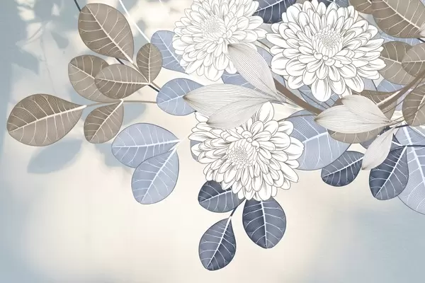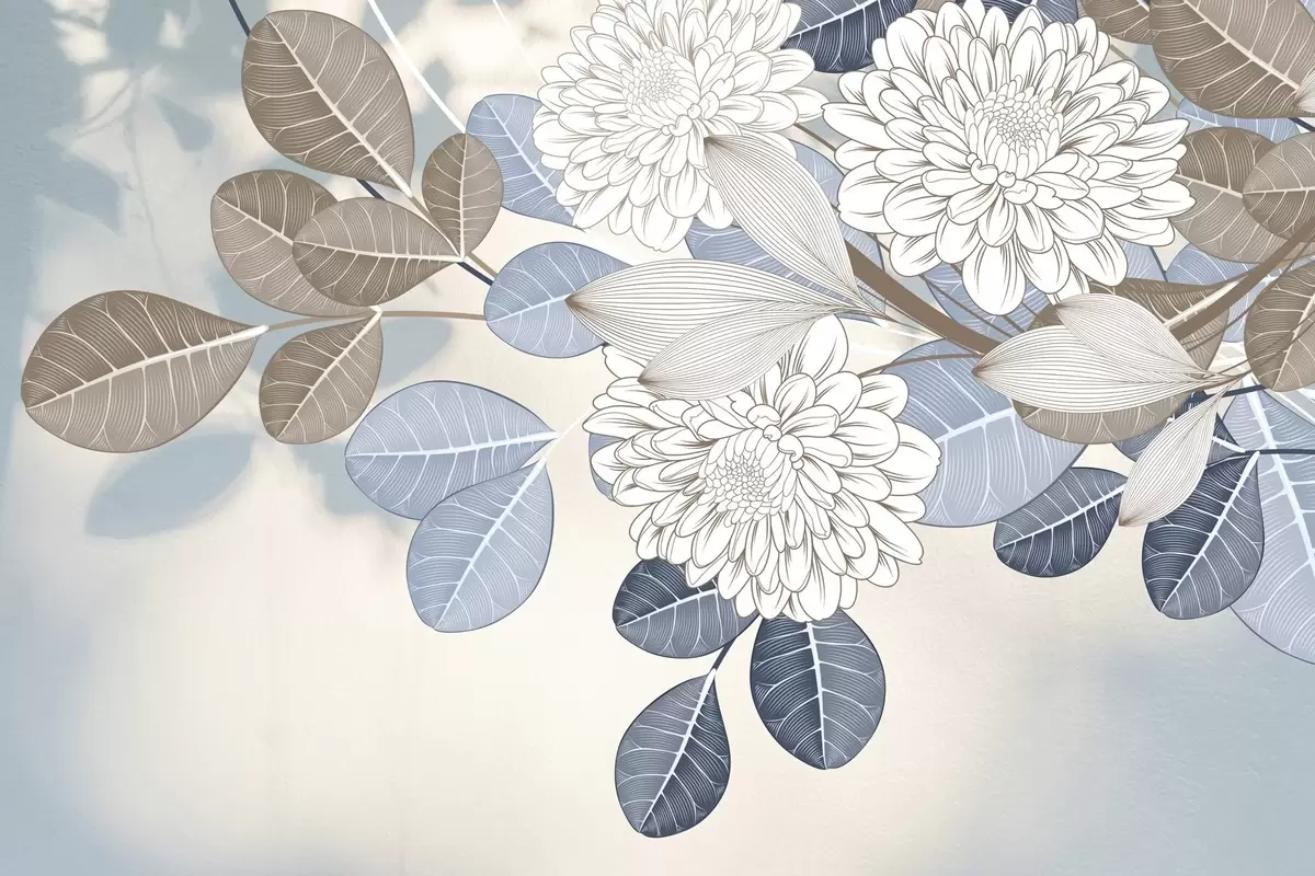 Fotomurales Flores blancas con hojas azules y marrones, fondo azul claro con textura, arreglo floral, dibujo lineal detallado Nr. w09496