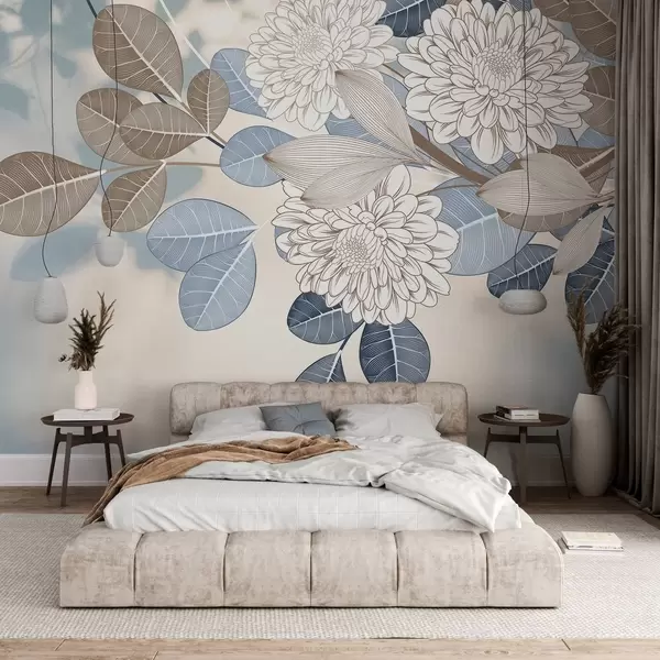 Fotomurales Flores blancas con hojas azules y marrones, fondo azul claro con textura, arreglo floral, dibujo lineal detallado Nr. w09496