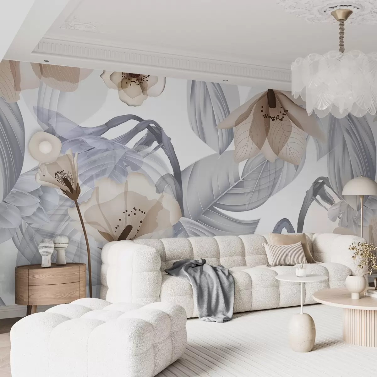 Fotomurales Flores marrones y hojas grises, fondo botánico floral, diseño elegante, colores suaves, detalles delicados y ligeros Nr. w09497v1
