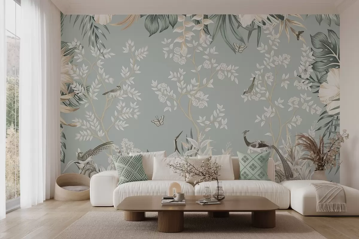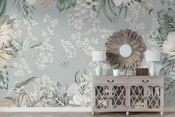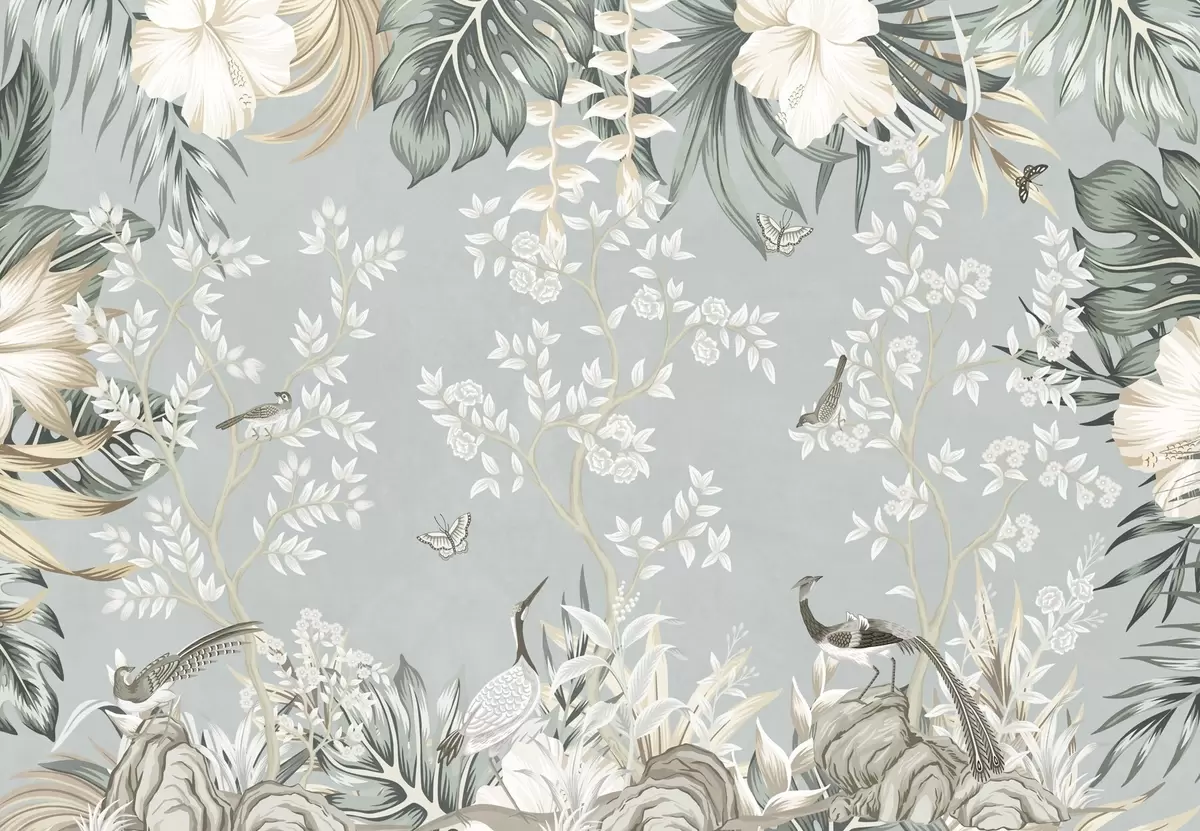 Fotomurales Arte tropical en tonos pastel con textura, con pájaros, mariposas, flores de hibisco, hojas de palmera y árboles sobre un fondo azul claro. Nr. w09528