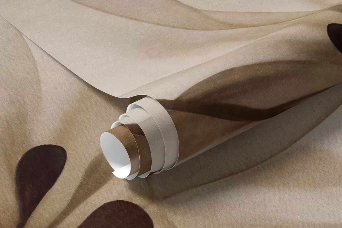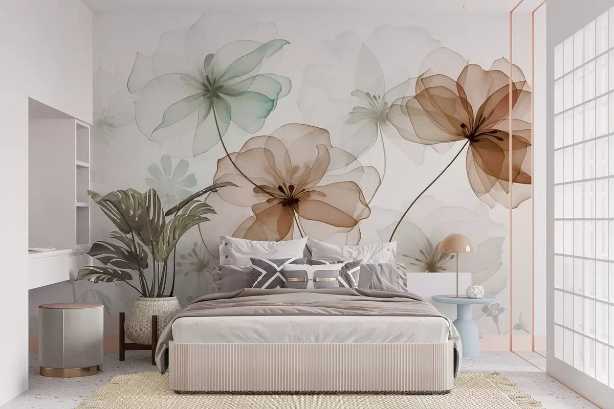 Fotomurales Flores translúcidas con pétalos marrones y verdes, tallos largos, fondo claro, colores suaves, diseño floral con textura. Nr. w09529