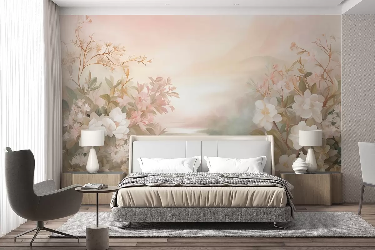 Fotomurales Un paisaje con un río rodeado de flores y plantas, colores suaves, cielo rosado, estilo con textura de acuarela. Nr. w09537