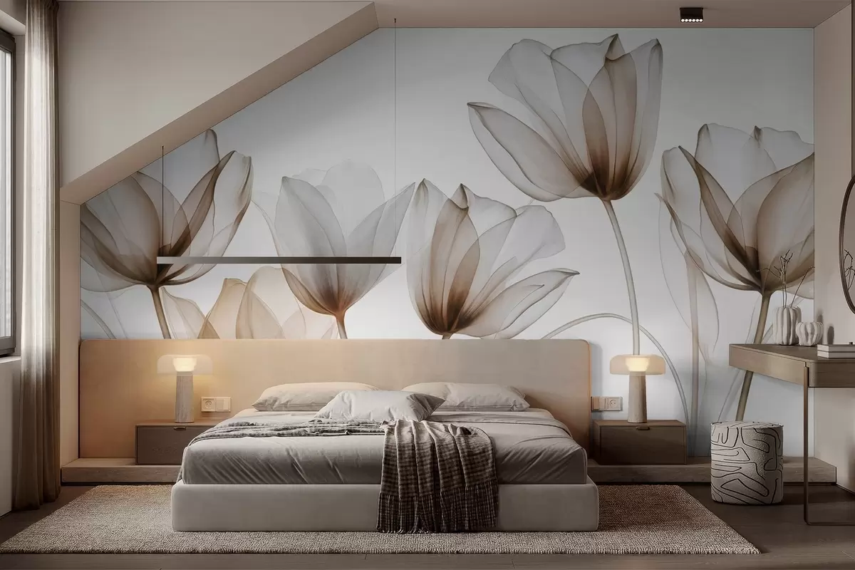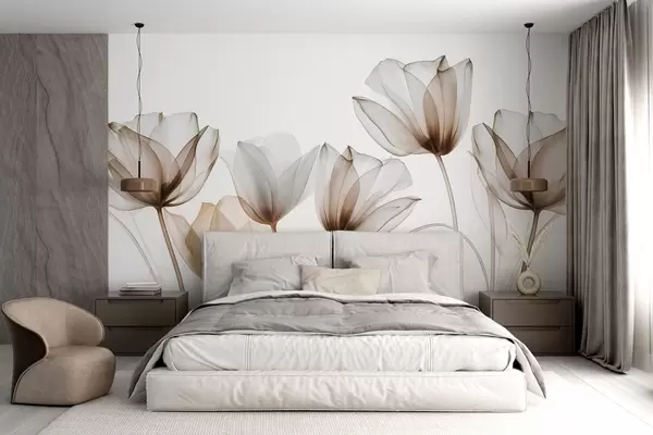 Fotomurales Flores de tulipán translúcidas de color marrón y blanco con tallos largos, sobre un fondo claro, delicadas y con textura, arte floral. Nr. w09538v1