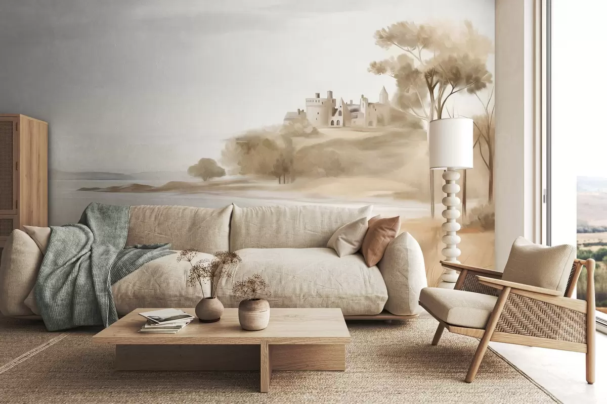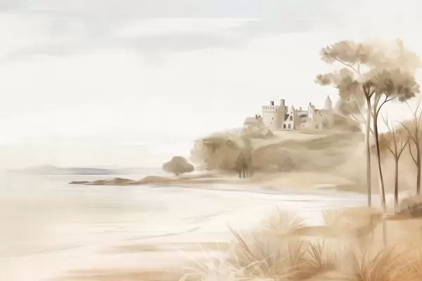 Fotomurales Paisaje con un castillo en una colina cerca del mar, una playa de arena en primer plano, colores apagados, arte texturizado. Nr. w09540