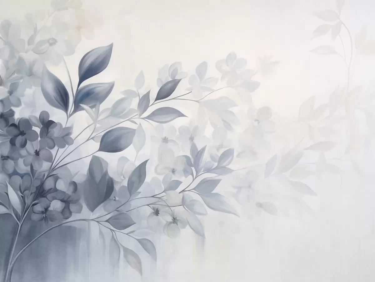 Fotomurales Rama azul y blanca con textura, con flores y hojas que se desvanecen en un fondo claro, estilo pintura acuarela. Nr. w09543
