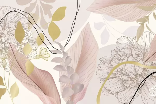Fotomurales Estampado floral abstracto con hojas grandes en tonos rosa apagado y marrón, con finas líneas negras y contornos florales blancos. Nr. w09544
