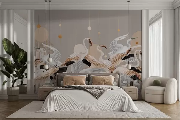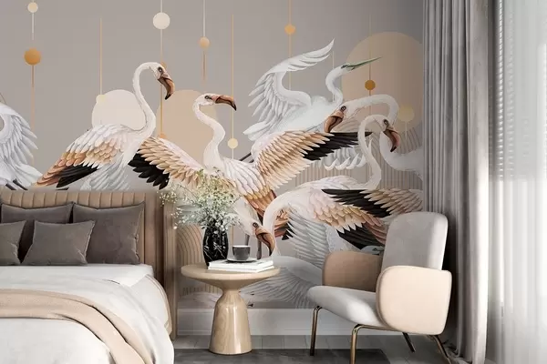Fotomurales Una bandada de flamencos blancos con delicadas alas, sobre un fondo neutro con líneas y círculos amarillos Nr. w09546v1