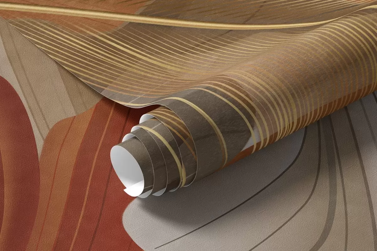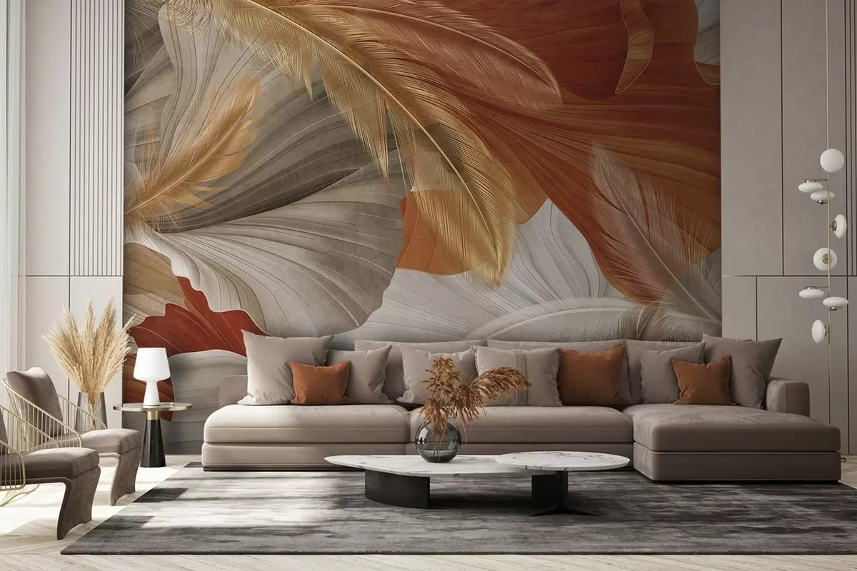 Fotomurales Formas abstractas grandes y fluidas con textura en colores crema y óxido con delicadas plumas amarillas, beige y marrones. Nr. w09549