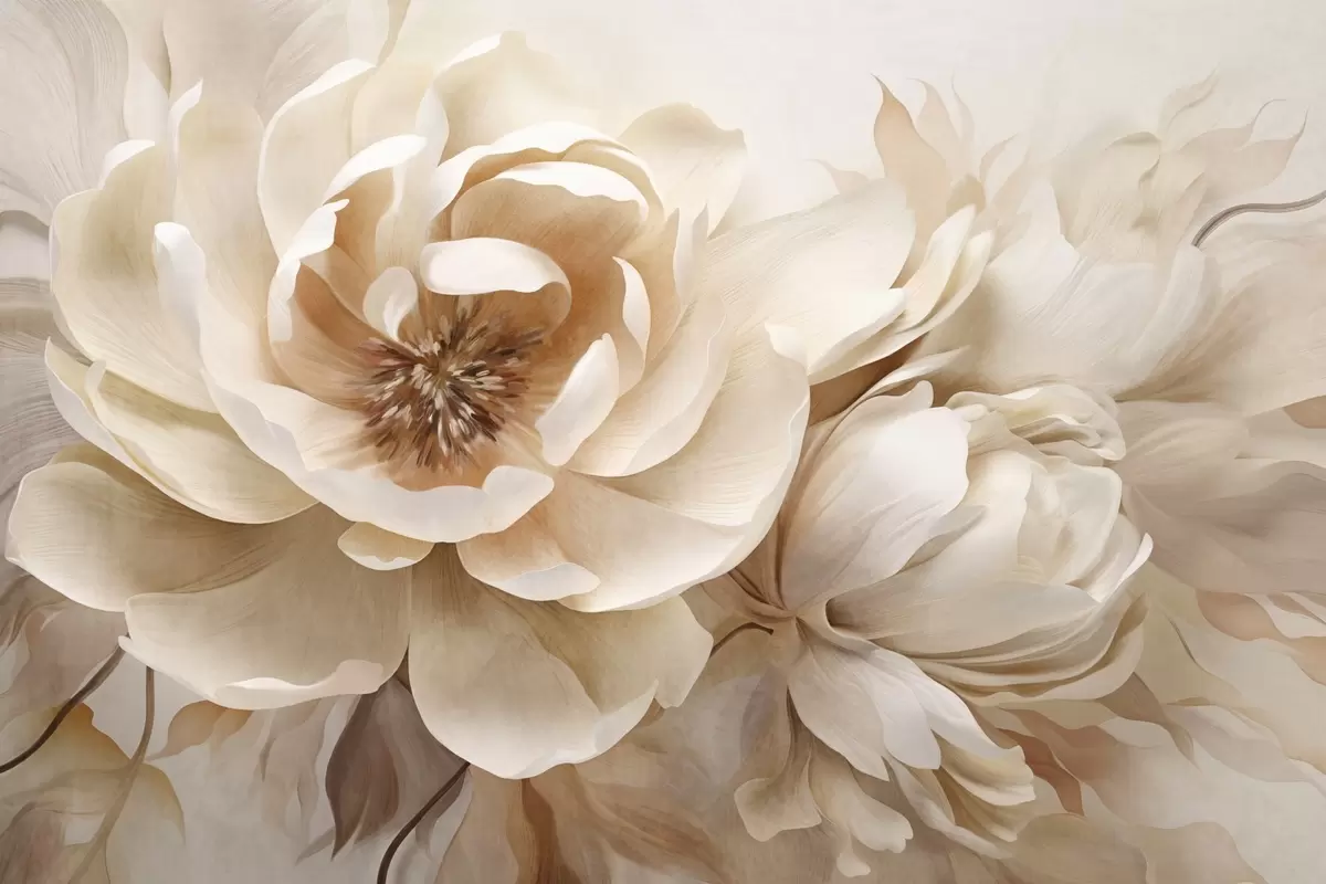 Fotomurales Peonías de textura cremosa con centros marrones y hojas sobre un fondo abstracto difuminado y claro. Nr. w09554