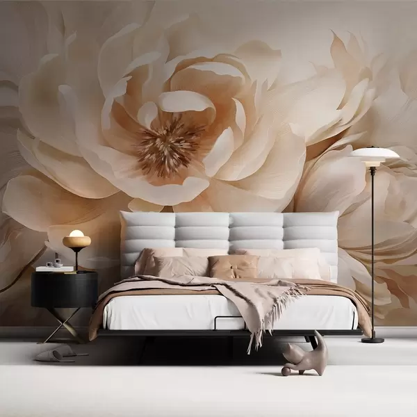 Fotomurales Peonías de textura cremosa con centros marrones y hojas sobre un fondo abstracto difuminado y claro Nr. w09554