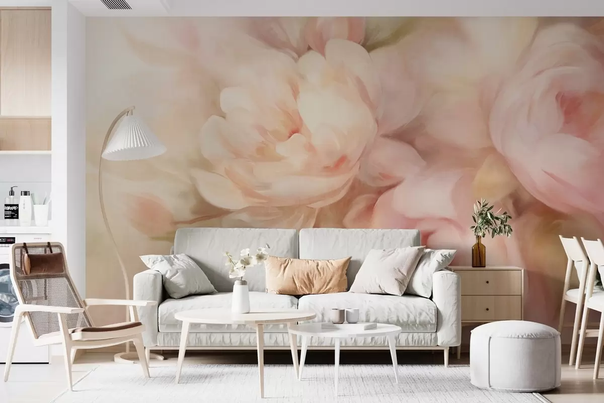 Fotomurales Peonías difuminadas en rosa pálido y crema con suaves pinceladas pictóricas, creando un arreglo floral con textura. Nr. w09556