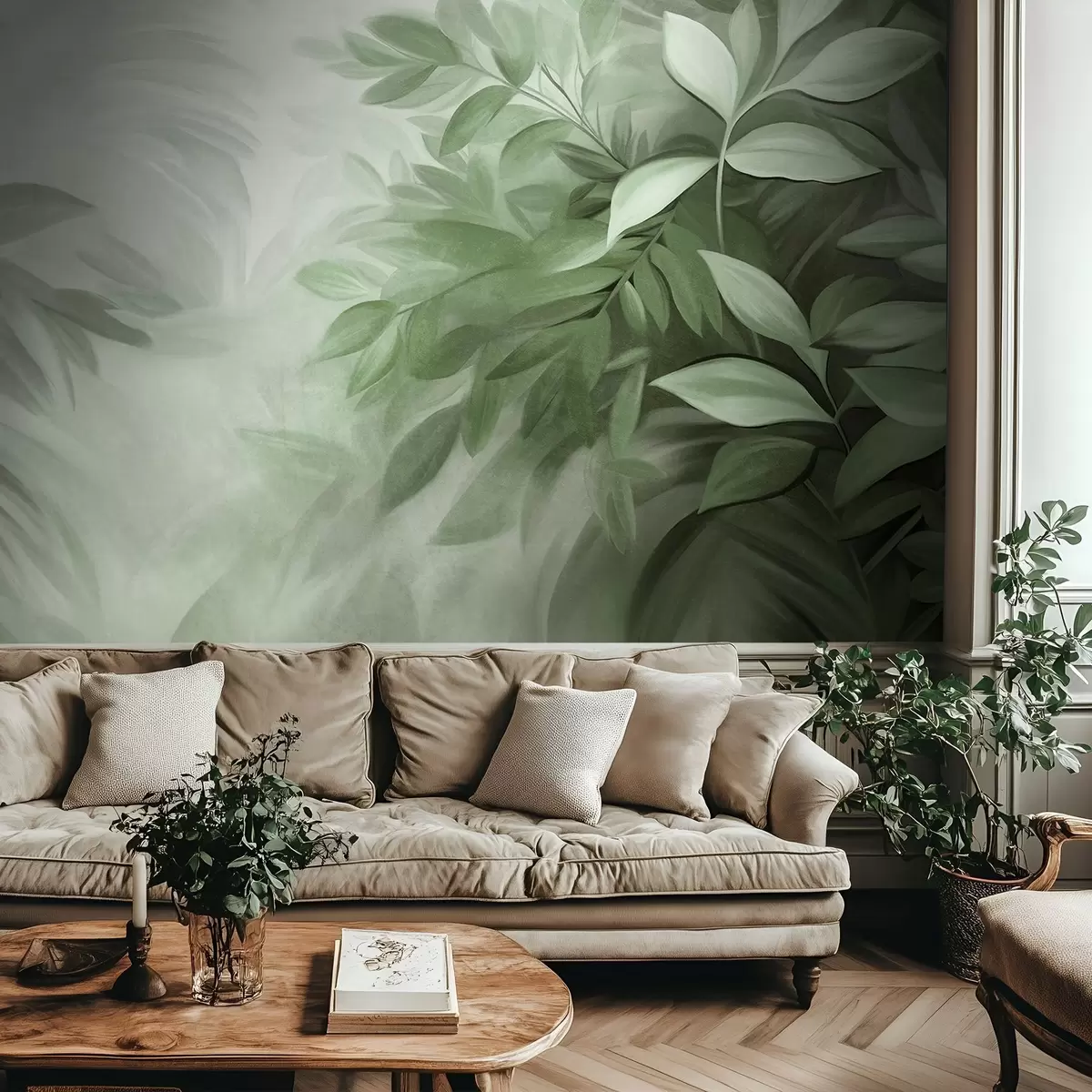 Fotomurales Hojas verdes y grises con un follaje de textura suave y difuminada, en un estilo pictórico con pinceladas visibles Nr. w09584v1
