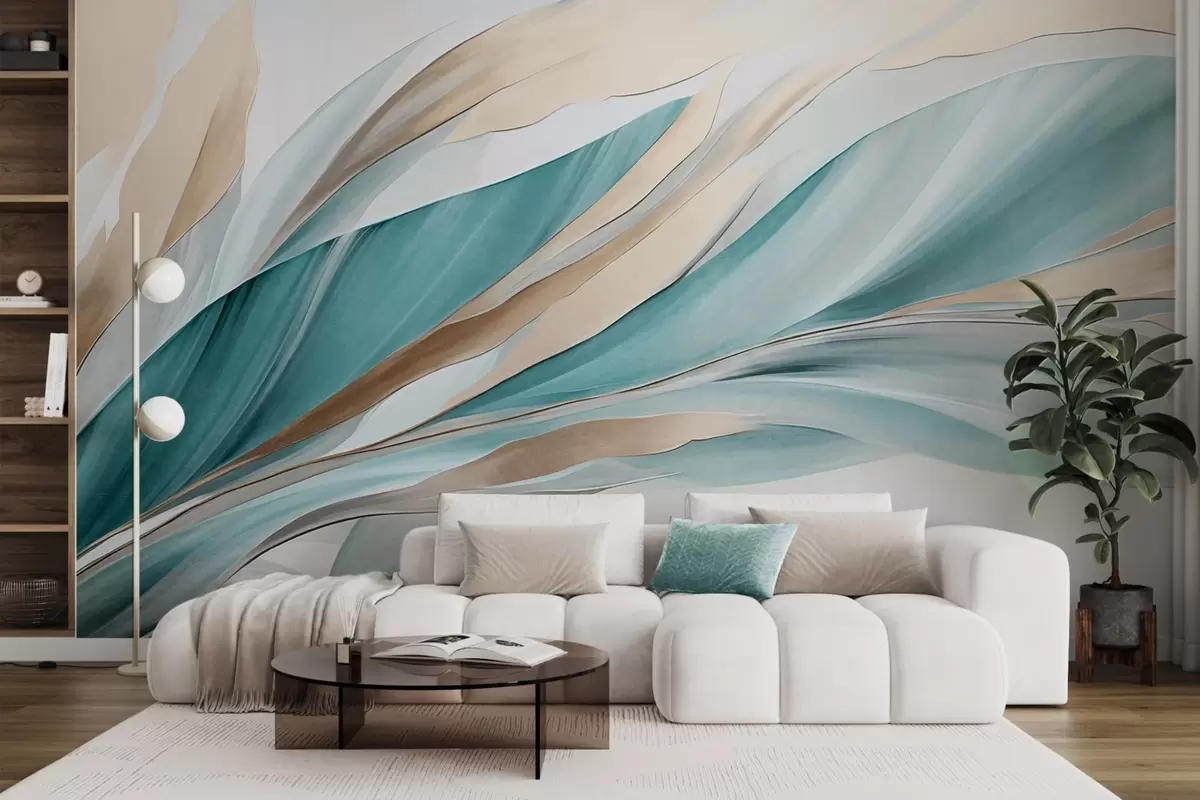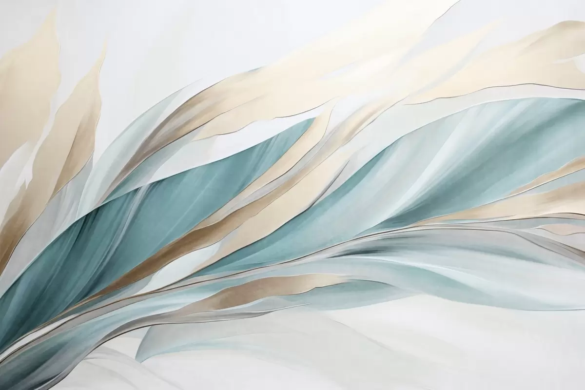 Fotomurales Ondas abstractas fluidas de color verde azulado y amarillo, con formas y líneas finas, sobre un fondo blanco, arte texturizado. Nr. w09585