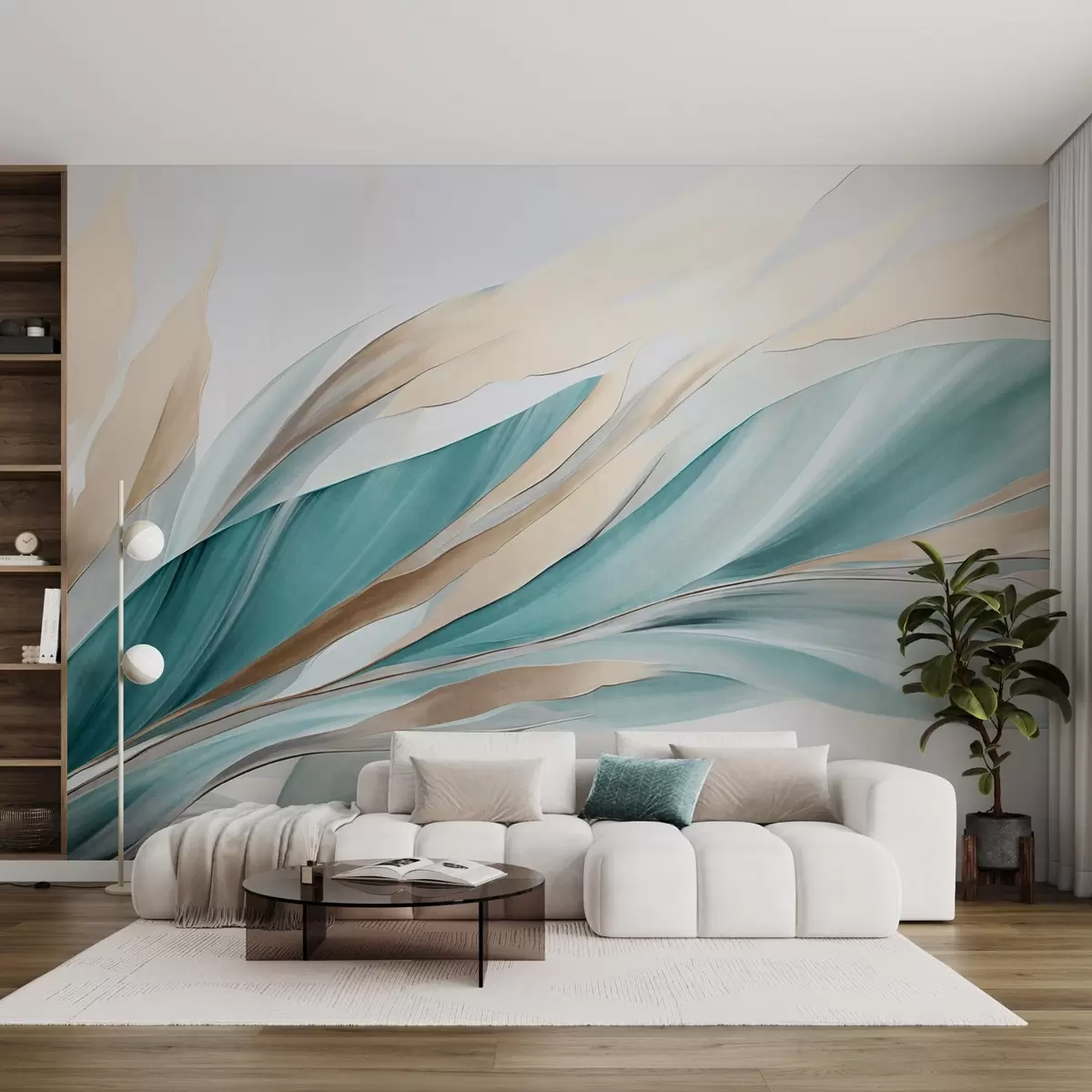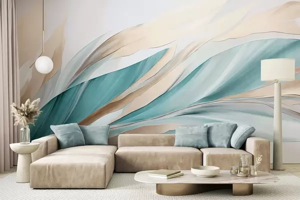Fotomurales Ondas abstractas fluidas de color verde azulado y amarillo, con formas y líneas finas, sobre un fondo blanco, arte texturizado. Nr. w09585
