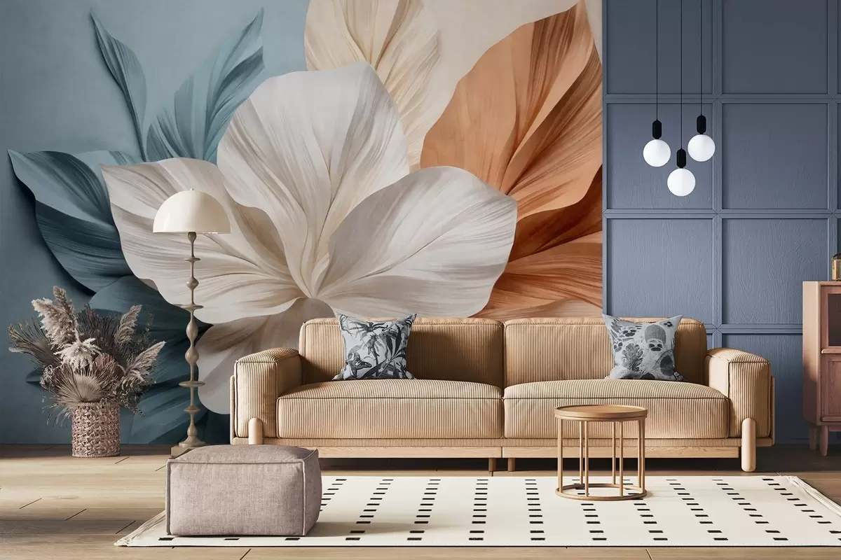 Fotomurales Flor abstracta de múltiples pétalos con hojas texturizadas en tonos melocotón y azul, fondo suave. Nr. w09604