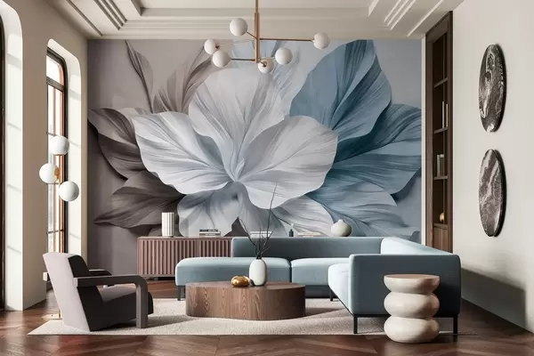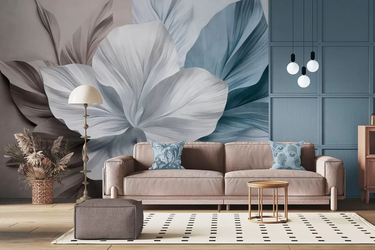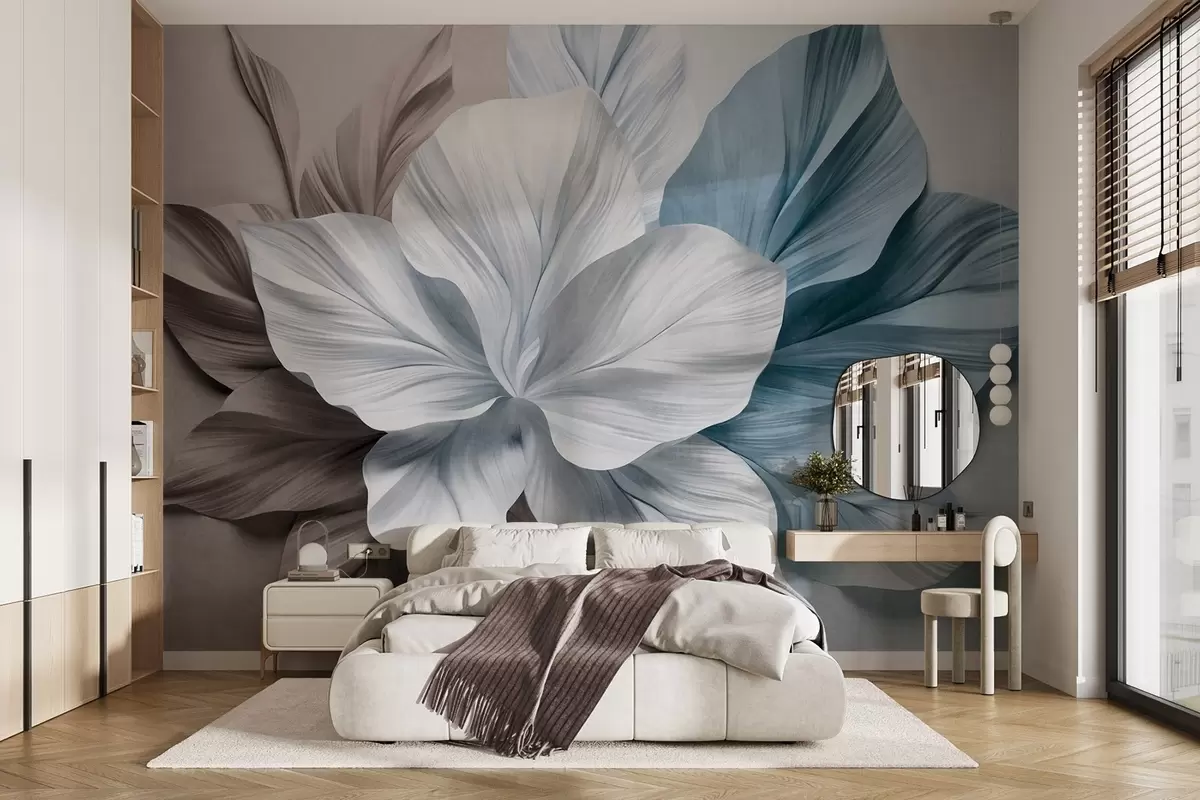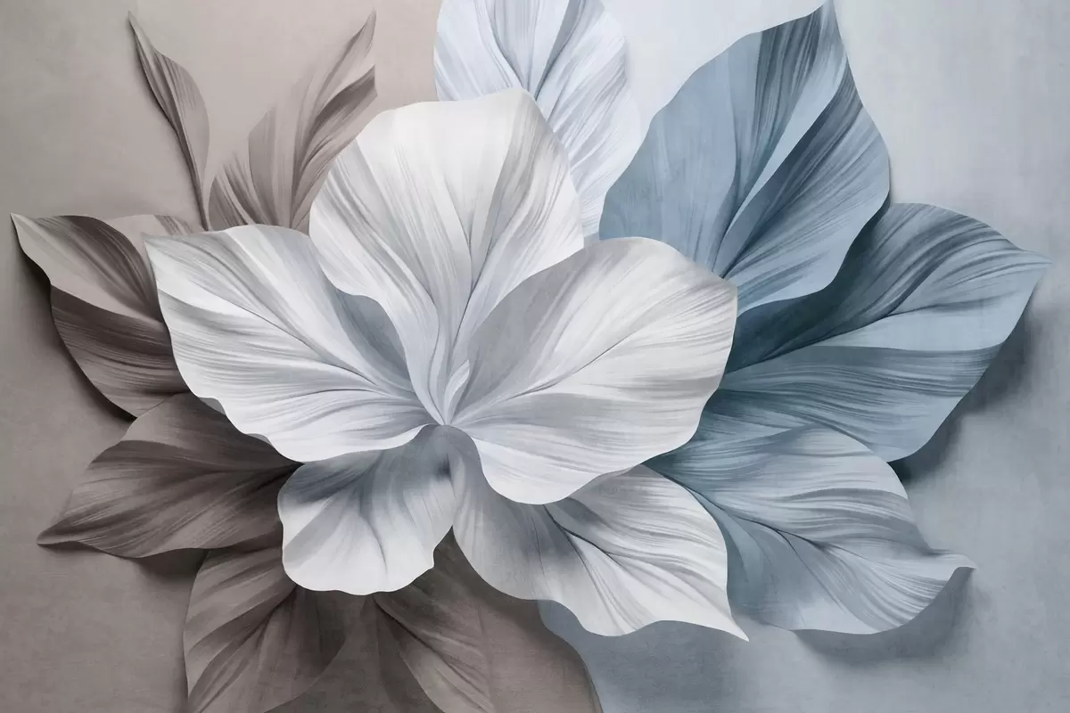 Fotomurales Flor abstracta de múltiples pétalos con hojas texturizadas en tonos marrones y azules, fondo suave. Nr. w09604v1