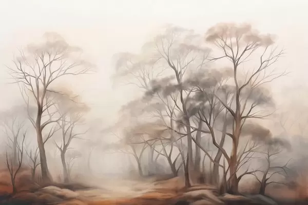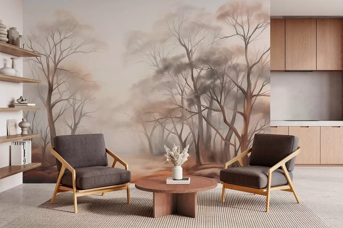Fotomurales Árboles con textura en un bosque brumoso, paisaje neblinoso con colores apagados y suave iluminación. Nr. w09609