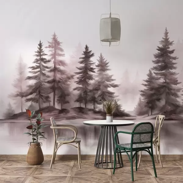 Fotomurales Un bosque brumoso con textura y altos pinos pintados de imitación. Nr. w09610v1